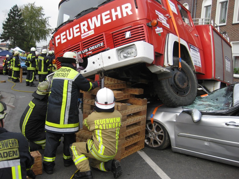 Einen enormen Bedarf an Rüstholz hatte die Station „PKW unter LKW“. Es galt einen PKW-Fahrer zu retten, auf dessen Motorhaube ein LKW stand. Nach einer gründlichen Lageerkundung wurde der LKW gegen Wegrollen gesichert. Anschließend wurde zur Sicherung der Last ein Rettungszylinder im Bereich der Vorderachse an den Rahmen des LKWs angesetzt. Danach galt es mittels Rüsthölzern den LKW zu unterbauen und somit ein ungewolltes Bewegen des Lastwagens abzufangen. Sehr schnell konnte man erkennen, dass für solche Einsätze ein umfangreicher Bestand von Rüsthölzern vorhanden sein muss. Zeitgleich wurden die Federwege der Vorderachsen von LKW und PKW mittels Spanngurten eingespannt. Dies sorgt beim Anheben des LKWs dafür, dass das Rad des LKWs nicht auf der Motorhabe bleibt und die Fahrgastzelle nicht in Richtung angehobenem LKW wandert. Nach Abschluss dieser Maßnahmen wurde der LKW durch zwei parallel eingesetzte Rettungszylinder soweit angehoben, dass der PKW entlastet wurde. Daran anschließend wurde der Fahrer durch die Fahrertür gerettet, nachdem diese mittels Spreizer entfernt wurde und der Fußraum erweitert wurde.